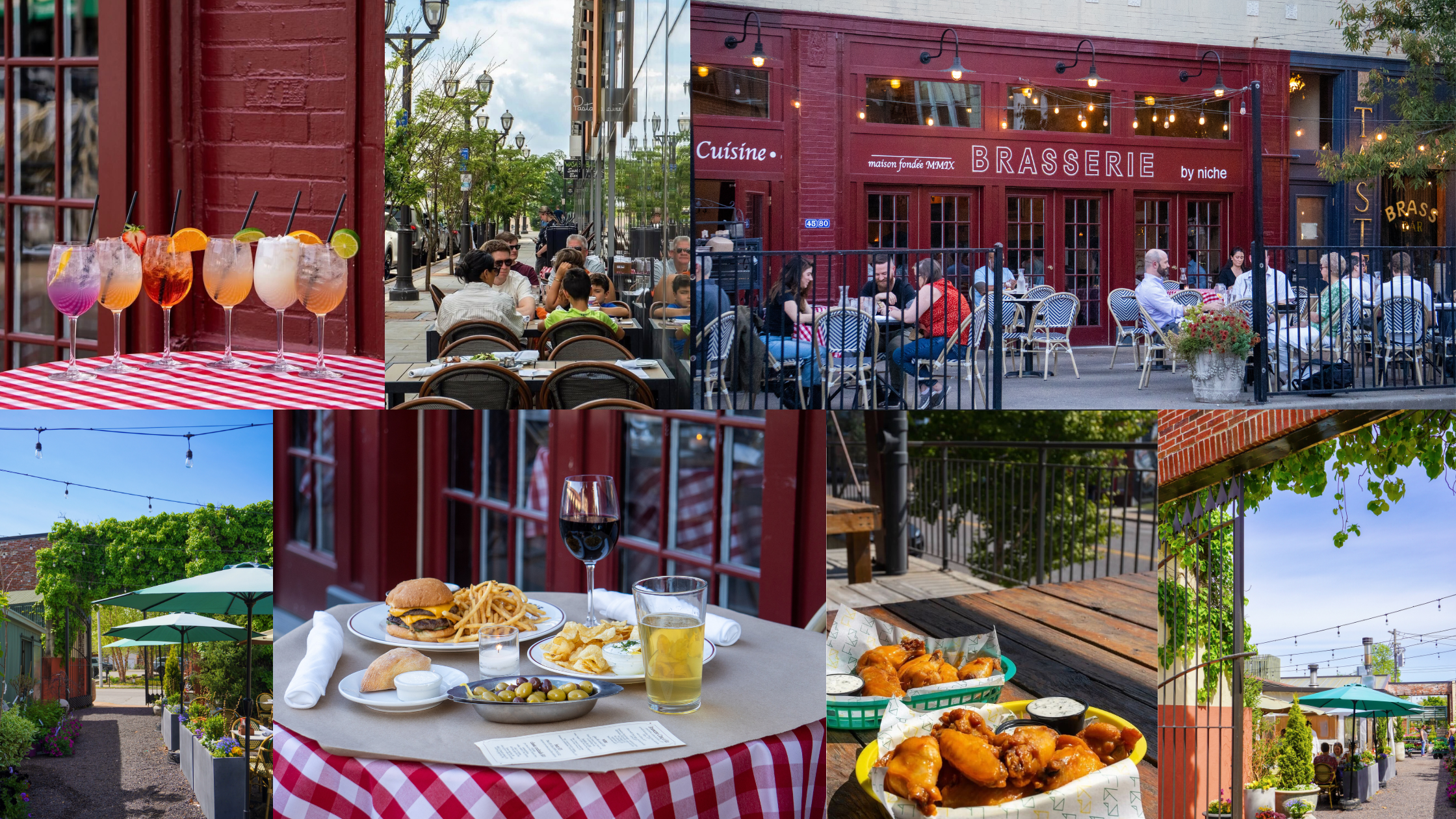From upper left to right: Brasserie by Niche Spritz Menu, Pastaria & Pastaria Deli & Wine’s Sidewalk Patio, Brasserie by Niche and Brass Bar’s Patio